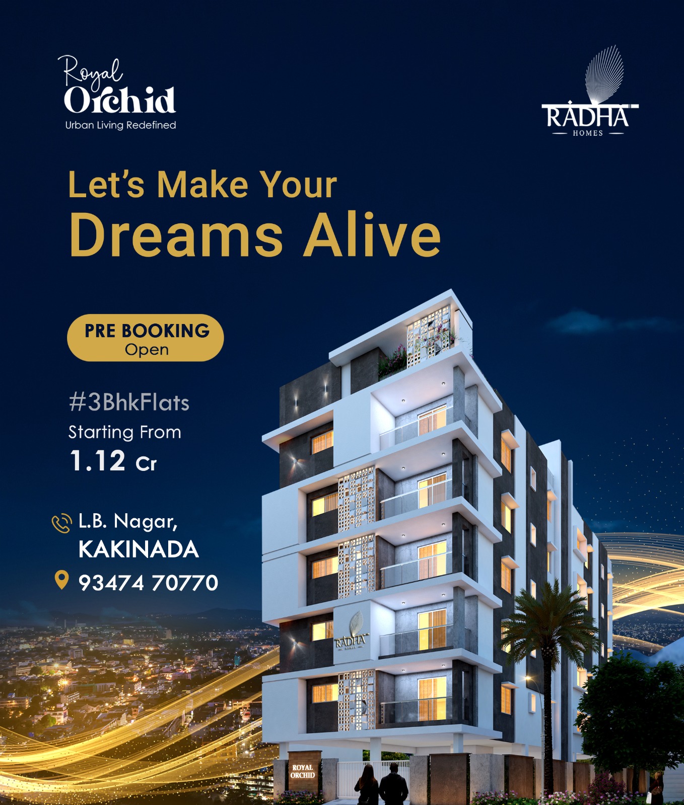 Radha Homes' newest development, Royal Orchid, is designed with luxury in mind. The apartments face both east and west. Two apartments per level ensures a quiet, peaceful environment and a high standard of living. Each apartment has three bedrooms, bathrooms, two balconies for relaxing in the fresh air, an open kitchen, a puja room, a living area, and a dining room. All this makes it premium in every aspect and a smart start to your new luxurious life.