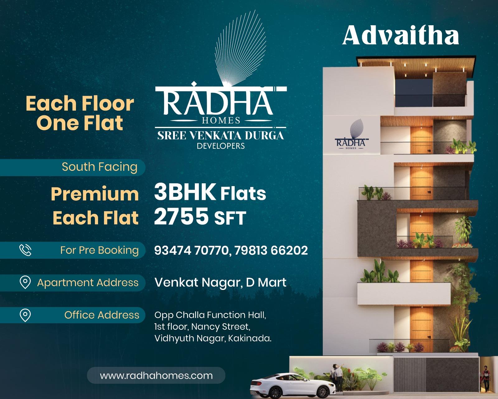 Radha Homes' newest development, Advaitha, is designed with luxury in mind. The apartments face both east and west. Two apartments per level ensures a quiet, peaceful environment and a high standard of living. Each apartment has three bedrooms, bathrooms, two balconies for relaxing in the fresh air, an open kitchen, a puja room, a living area, and a dining room. All this makes it premium in every aspect and a smart start to your new luxurious life.